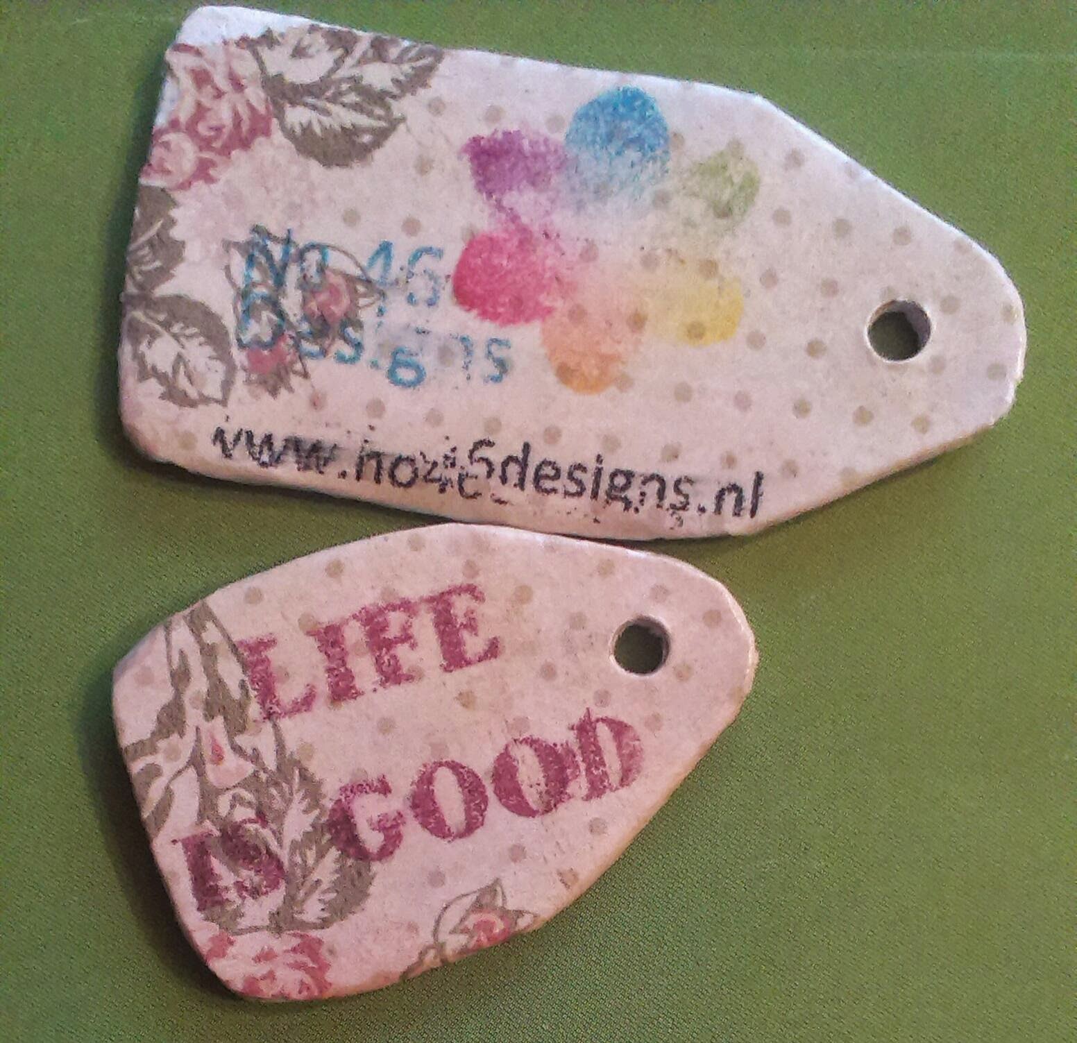 Na een ochtend werken (van 05:15-10:30 uur), kan ik nu weer rustig schrijven aan mijn blog. Gisteren heb ik weer een hoofdstuk gelezen uit het boek van Kelly Rae Roberts. Dat gaat over de expressie van onze emotie(s) in creatieve projecten. Soms omdat we het verbaal niet kunnen verwoorden, soms om oude wonden te helen, soms om het leven van nu te vieren. Het laat ons veranderen van de persoon die we waren in de persoon die we willen zijn. Om dat te bereiken moeten we de vergeten of verdrongen momenten omarmen en herbeleven; alleen dan kunnen we weer verder. Het hoeven niet per se nare herinneringen zijn, het kan ook juist zijn dat je terugdenkt aan dat vrolijke kinderliedje. Het gaat bij het maken van je project uiteindelijk niet om het resultaat, maar vooral om het creatieve/emotionele proces. Het maakt ons weer compleet en onze geest gaat groeien. Dat merk ik zelf op dit moment; ik ben zo opgewonden over wat ik zou willen bereiken, dat ik ook haast niet kan stoppen met het maken van mooie, leuke dingen. Ik wil maar met klei in de weer, met verf , papier en medium gel. Zo móest ik gisteravond per se die twee leuke labeltjes van klei afwerken, waar ik zondag al mee begonnen was. Het resultaat: